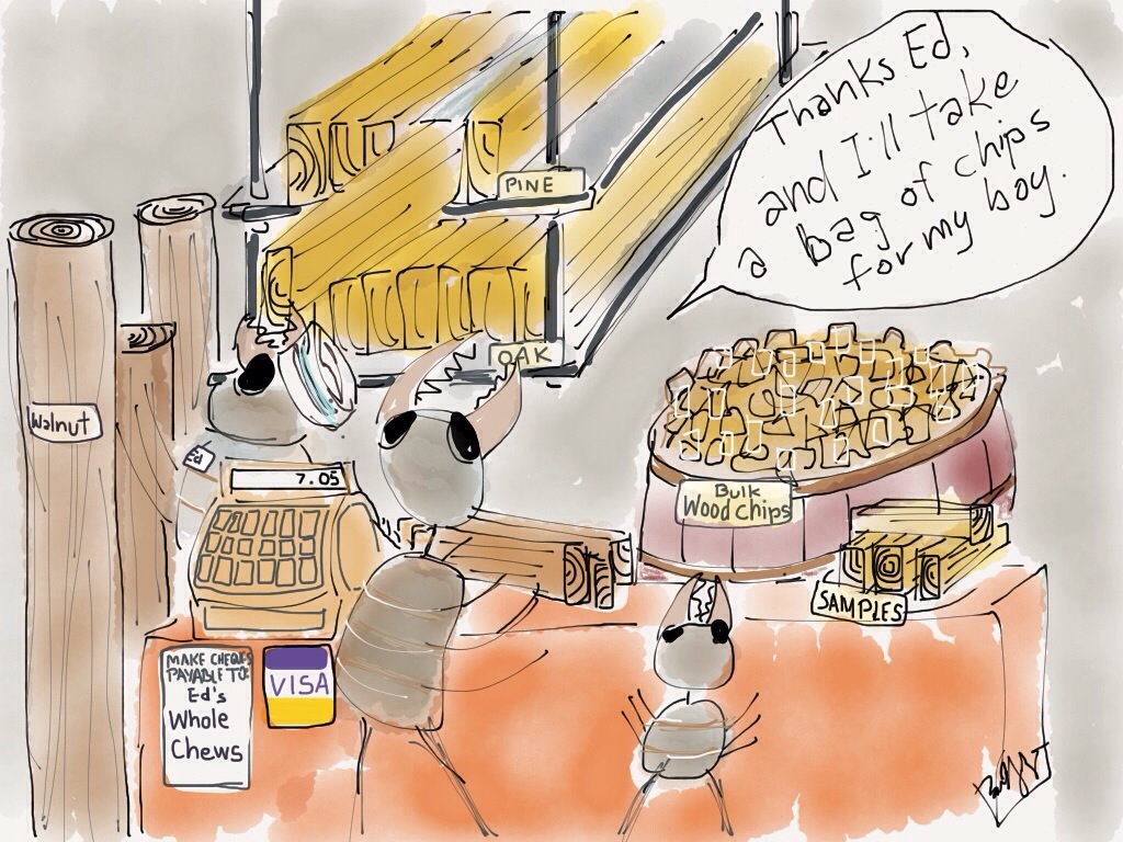Why, after all these years, am I thinking of termites? Doesn’t matter, at least now I can laugh about’em! The idea came to me this morning at Office Depot in Chicago, and when we got to our room in Milwaukee, I cranked it out in fewer than 5 minutes, maybe 10 with the coloring and advertising. I’m trying to run with ideas like this, even when I leave my back pack with my iPad in it at our cousin’s house!?! Thanks Ann, for letting me use your iPad.