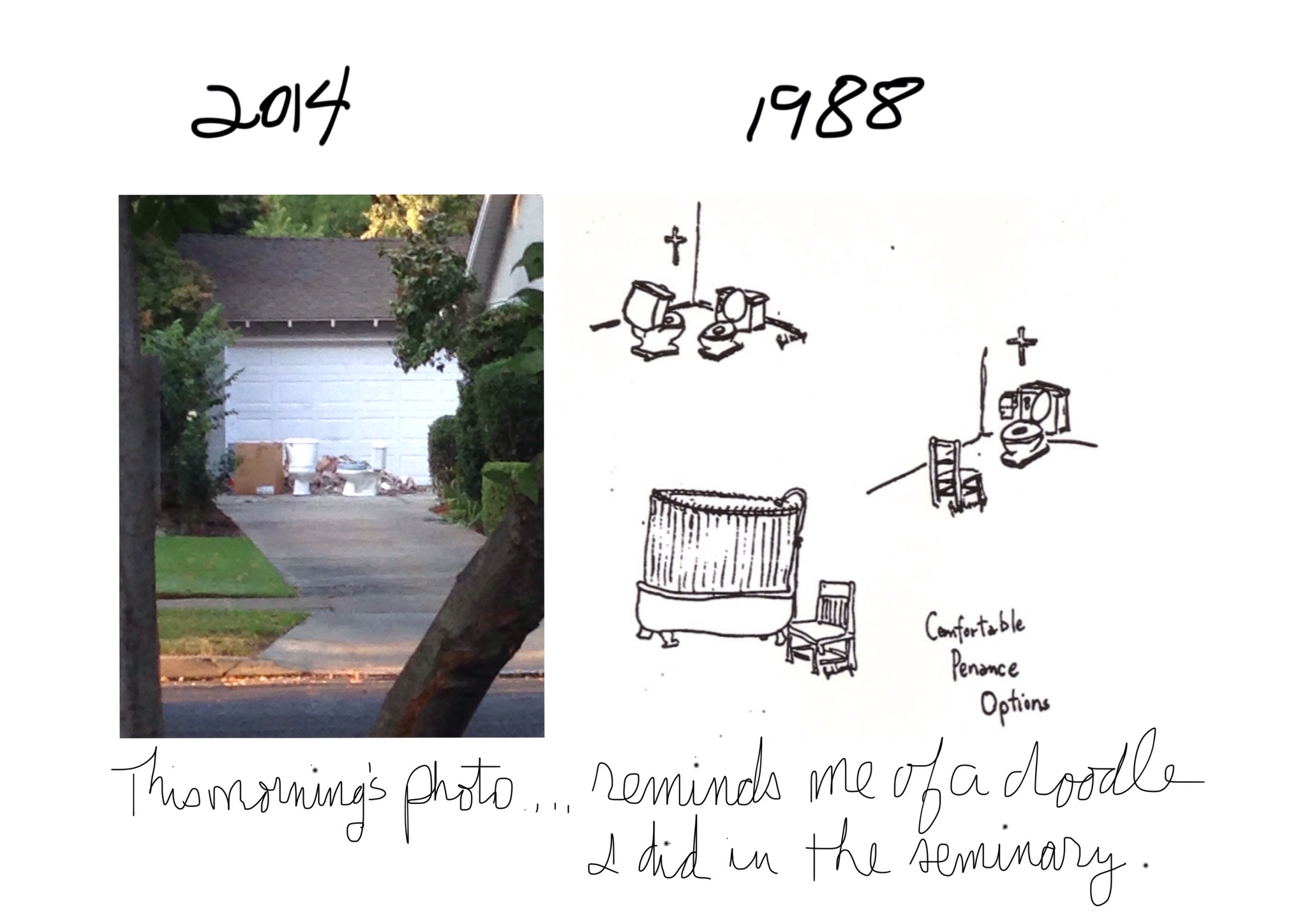The house across the street is undergoing some renovations, and little by little they’re hauling away what they’re replacing. From my seat at the breakfast table, horizons spanning a quarter of a century are fused per omnia saecula saeculorum. Amen.