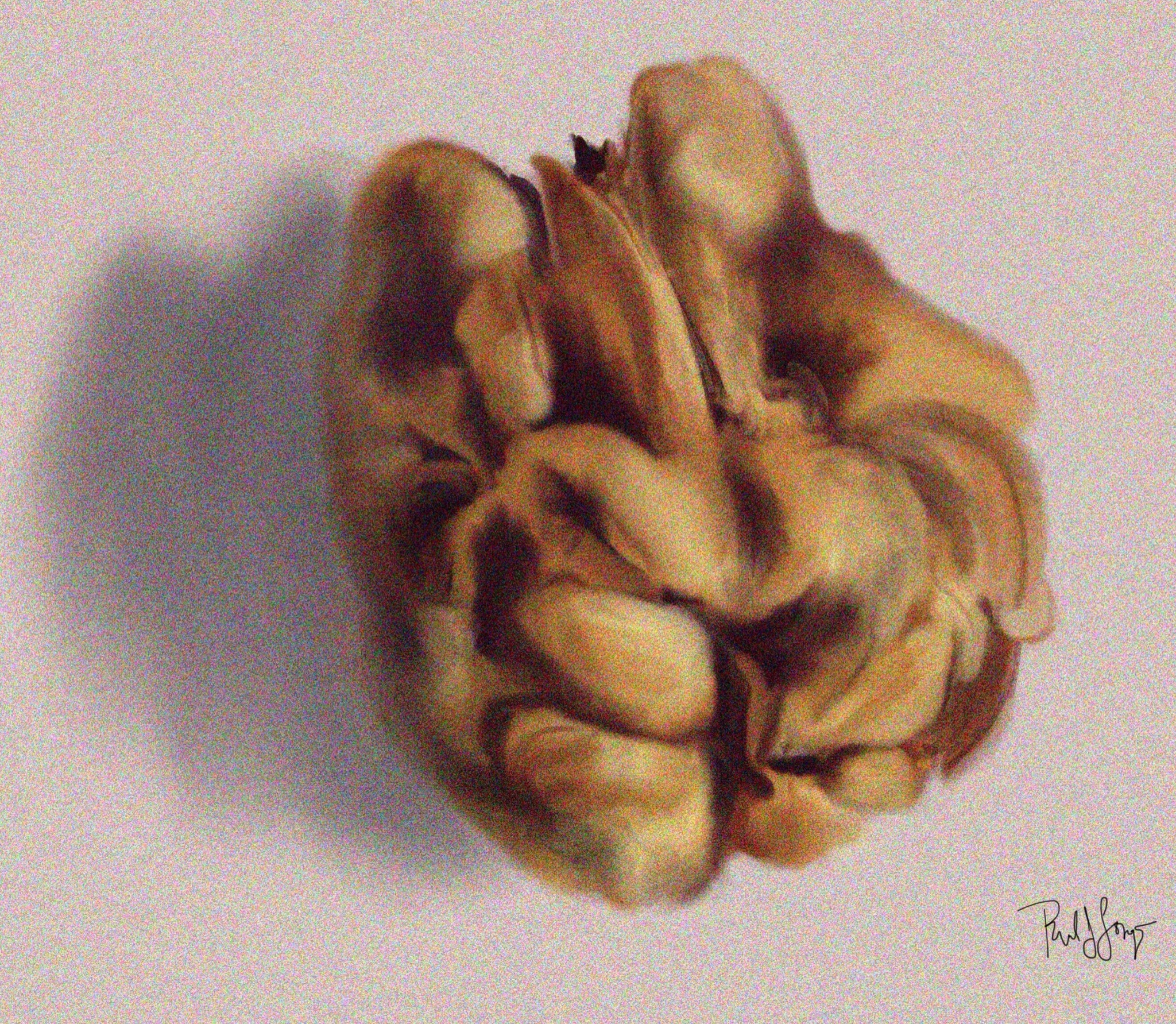 It all started this morning while I was cracking about two dozen walnuts, walnuts that I personally saw shaken from a tree. One came out whole; I photographed it and tried to draw it in Procreate. I got so far and simply stopped. Time was flying. Too much time.