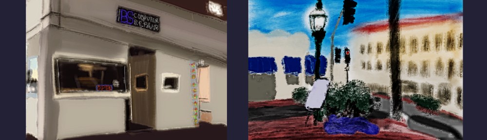 Almost two weeks ago I participated in – as an artist – my first Merced Art Hop (MAH). I was stationed at Binary Systems Computer Repair on the corner of Main St. and M St. in downtown Merced, CA.. About 20 people stopped in to chat and see prints on canvas and paper of my digital, iPad drawings. I learned a lot, sold a piece, and got an order for a larger canvas print of one of the images. As folks strolled by, I sketched these two drawings of my view shed in Procreate (with final touches in iColorama).
