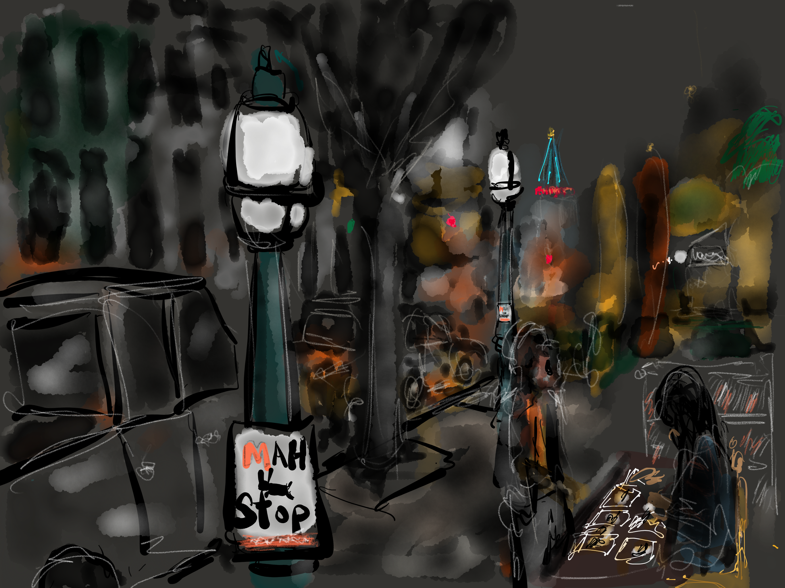 This time I dragged along an easel to hold my iPad and positioned myself out front on the sidewalk, which coaxed a few people into the shop, where I had paper, canvas, and metal prints for sale. As night fell, I drew this portion of Main St.. A colleague of mine at the Enrichment Center, Ashlee, was tabling right next door; so, I had a familiar subject in a familiar setting. Next time I’d like to add a larger monitor or even project the unfolding image onto a wall or screen.