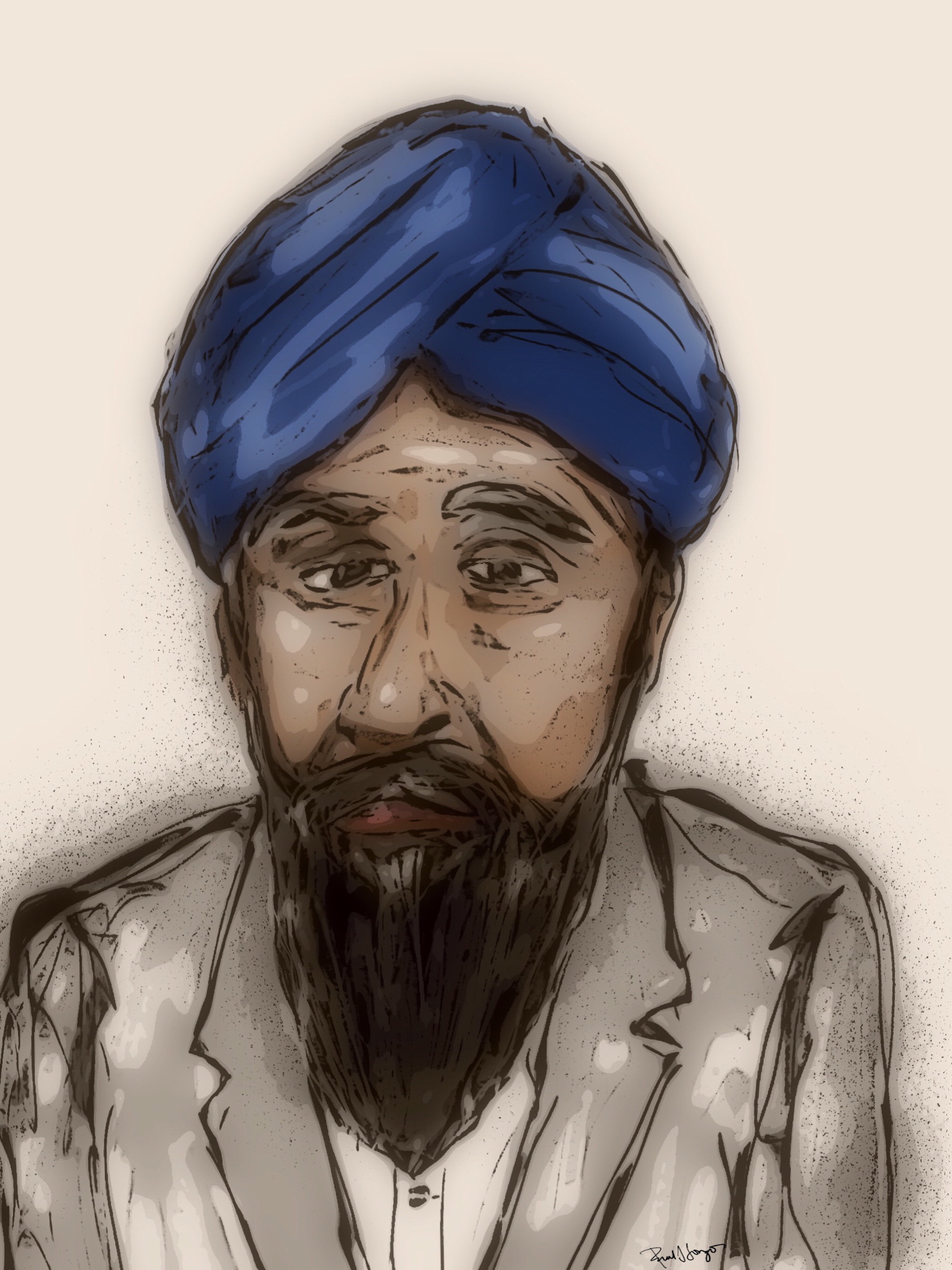 Last night, May 6, 2018, while watching United Shades of America, catching an interesting and informative episode focusing on Sikhism, seeing my first Californian Sikh almond farmer, and being intrigued by the turban (click here to view a gallery from the show), I sketched the following image on my iPad Pro with an Apple Pencil, using Sketch Club and iColorama: