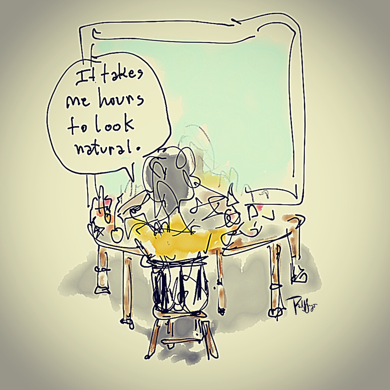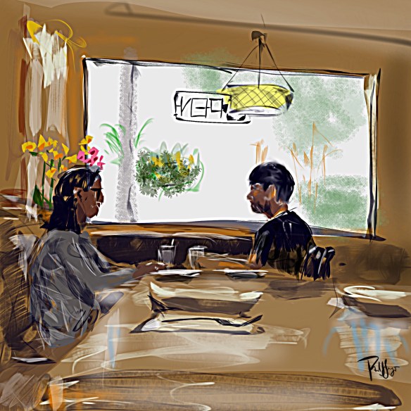 Back in early May 2019 I attended an all-day conference held at Stanford University, and so I went up the day before to have a relaxing meal and get a good night sleep. That evening I was lucky to find a restaurant right across the street from the hotel in Palo Alto, CA called Siam Fine Thai Cuisine. As usual, I took my iPad Pro and Apple Pencil, which I used while I slowly sipped my beer and ate my pad Thai with tofu. There were folks sitting to my left next to the window, and they became that evening’s practice in the Sketch Club app. When the owners saw what I was doing, they got curious. I showed them the piece, and they liked it enough to express interest in obtaining a copy. Check back to see an image of the wall hanging at Siam Fine Thai Cuisine. Here’s the piece: