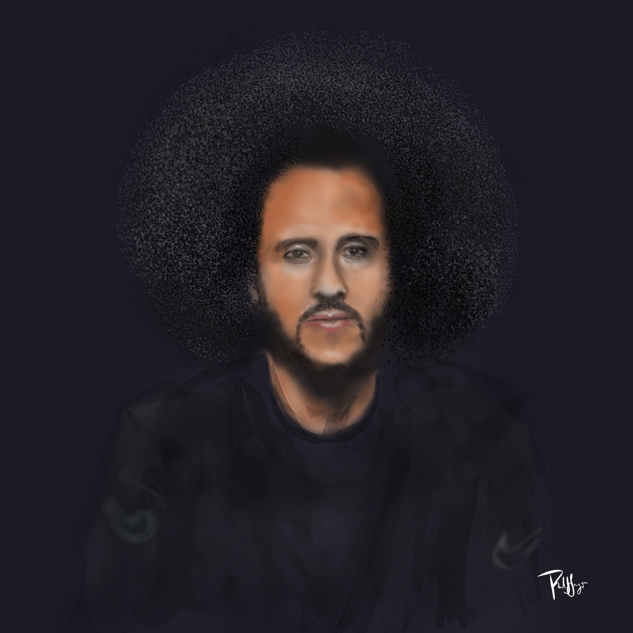 I saw a photograph of Colin Kaepernick on a meme that called my attention. I liked it enough to want to draw it free hand in Sketch Club. The meme’s below. The painting took 1 hour and 10 minutes, and I applied 2,895 brush strokes, 65 undos.