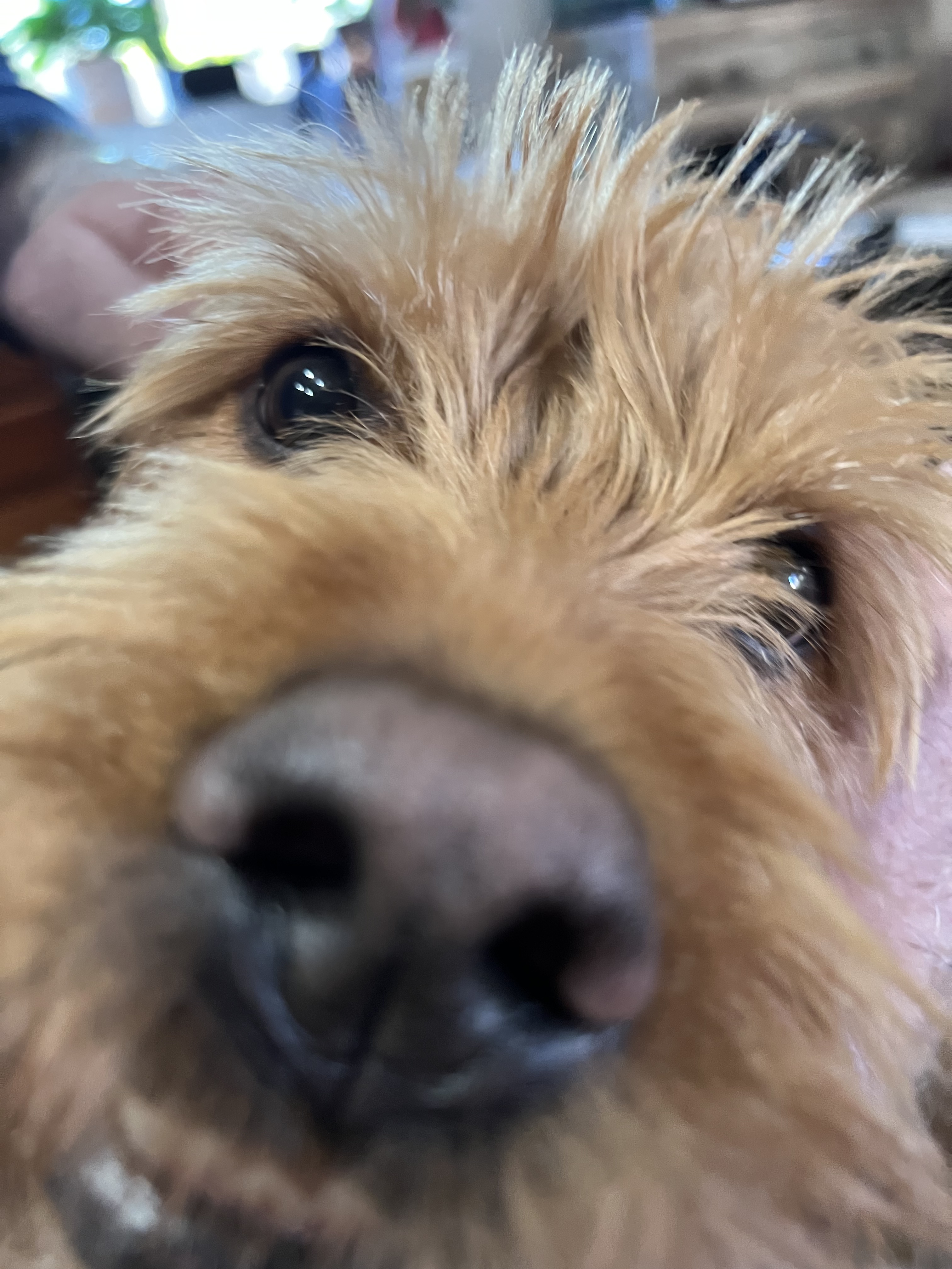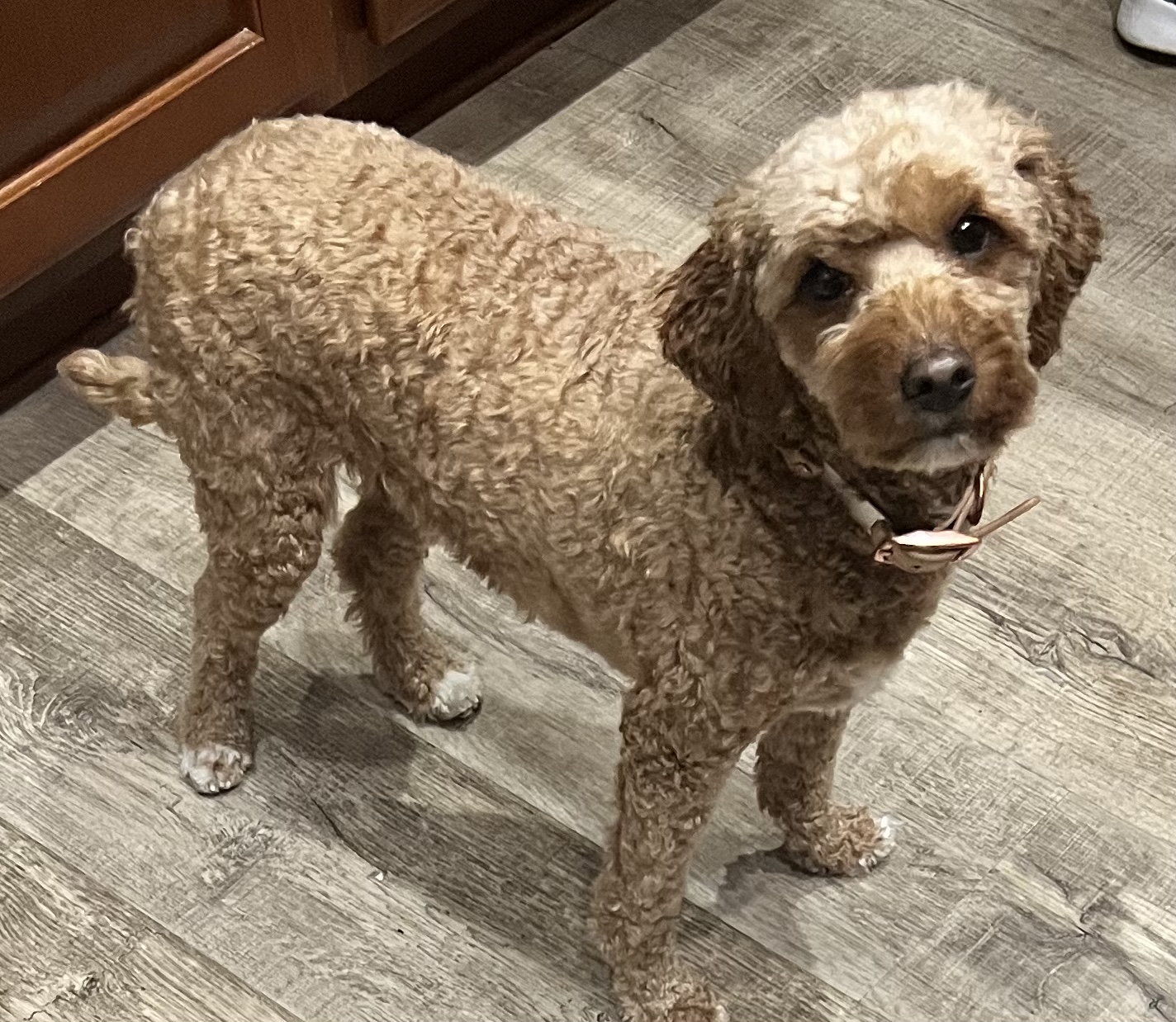 Alani’s one of four beautiful dogs, including Caula, a Miniature Dachshund; as well as Shiloh and Nova, Toy Labradoodles, who are sisters. There’s a cat too, Hula, a loyal Tabby. Now back to Alani, AKA Lani, Alonzo, A-Lonzo, who spent a lot of time on my lap. She’s a Mini Labradoodle offspring of a Rare Red Labrador and a Poodle.