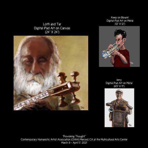 “Lotfi and Tar,” “Keep on Blowin’,” and “Jerry” are part of “Provoking Thought,” a show of the Contemporary Humanistic Artist Association (CHAA) of Merced, CA, March 10, to April 17, 2021 at the Merced Multicultural Arts Center (MAC).