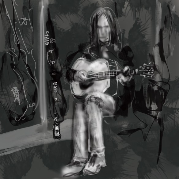 The iPad painting below was supposed to be Joni Mitchell. It started out as her, and then it kinda’ became someone else. Ok, what’s this all about? Well, it started when Joni Mitchell wrote, “For Free,” a lovely song about an experience she had at an intersection on foot while “waiting for the walking green,” while she happened to hear some nearby guy playing a clarinet “real good” and “for free” all before the “signal changed.” Fast forward, I heard a newer rendition of that song performed by David Crosby and Sarah Jarosz (listen below via YouTube). I fell in love with the song, especially this newer rendition. I’m intrigued by the encapsulation of such a spacious and almost timeless experience into such a brief and situated moment; and, I just love how David and Sarah sing together. What a beautiful song! What a beautiful songwriter! So I looked for some images of Joni Mitchell, you know, to thank her and to get some Saturday practice. And I found a photo that called my attention: