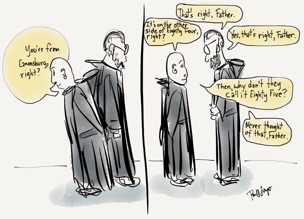 There was an old monk whom I’d see on a daily basis back, oh, thirty some odd years ago. (This was posted in 2015, so grab a calculator.) We’d have a similar encounter each and every day. For me it was repetitive; for him each exchange was brand new. He was familiar with Western Pennsylvania, my home region, and he somehow knew about Eighty Four, PA, which was not far at all from my hometown, Canonsburg, PA. Not surprisingly, the headquarters of 84 Lumbar is located right there in Eighty Four, PA.