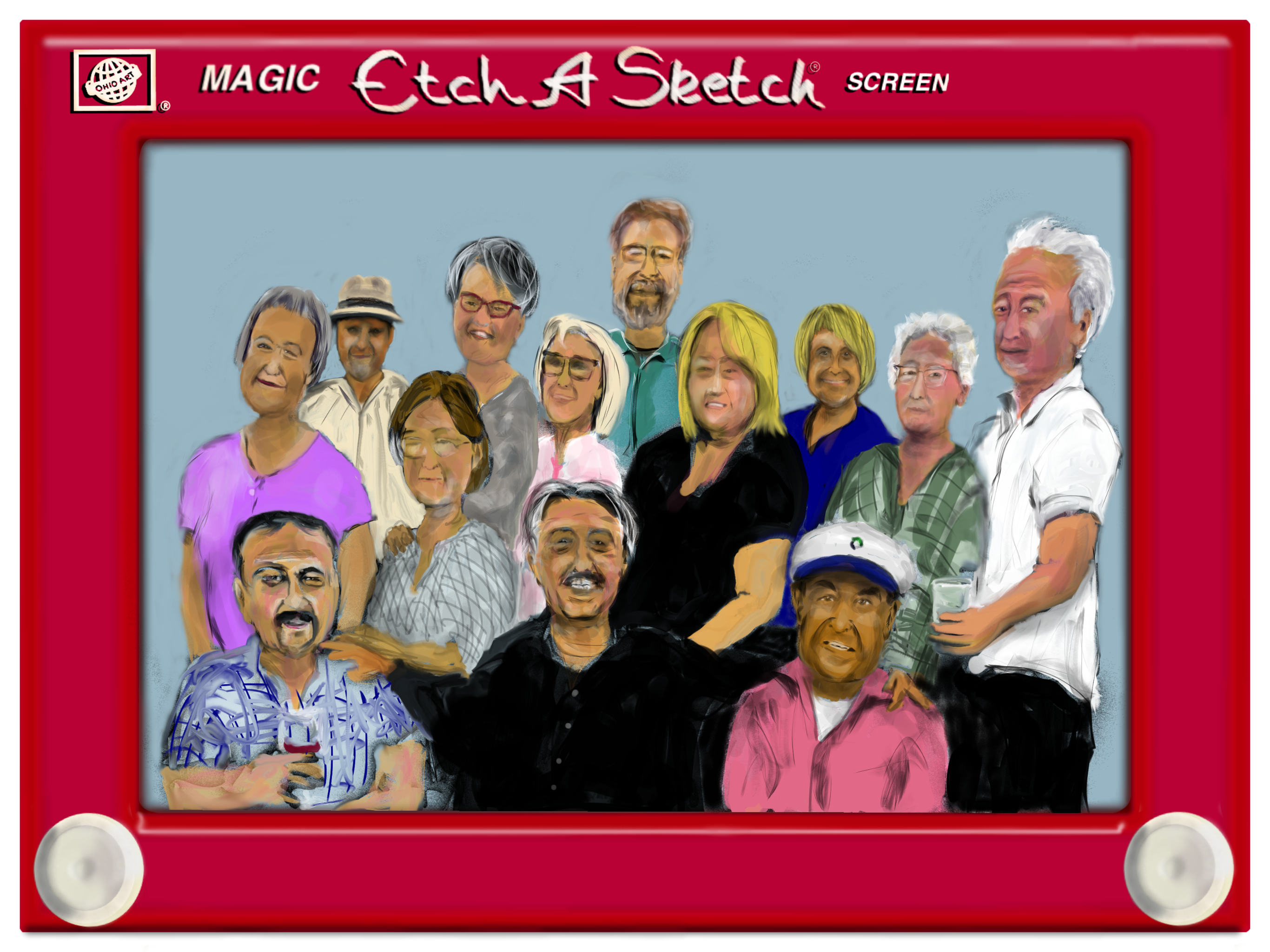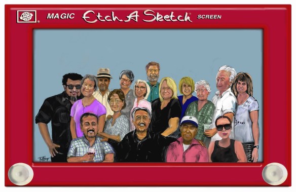 On the night of the group photo, of course, we realized three people were missing. So I worked with Cheryl Barnett, who administers CHAA’s Facebook page to find photos of the three missing CHAA members and to add them to the group caricature. It was an iterative process to say the least, but a fun one. I could easily show a dozen iterations. If you look closely, you’ll see some changes here and there in addition to the three additional artists. I’ll skip to one of the final drafts before I dropped it into the Etchasketch frame: