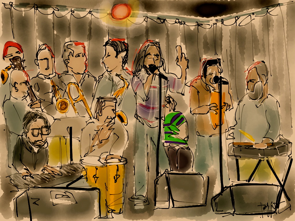 Thought it would be fun to do a one, long, crooked line drawing, and then go back with just a little color. The subjects are the Parranderos Latin Combo, who performed last night at the Moberg Gallery in Des Moines, IA to raise additional money for their upcoming trip to record an album in San Juan, Puerto Rico with Grammy award winning producer, Ramon Martinez. My friend Fernando Aveiga, musician entrepreneur, animates this project in collaboration with a constellation of co-stars.