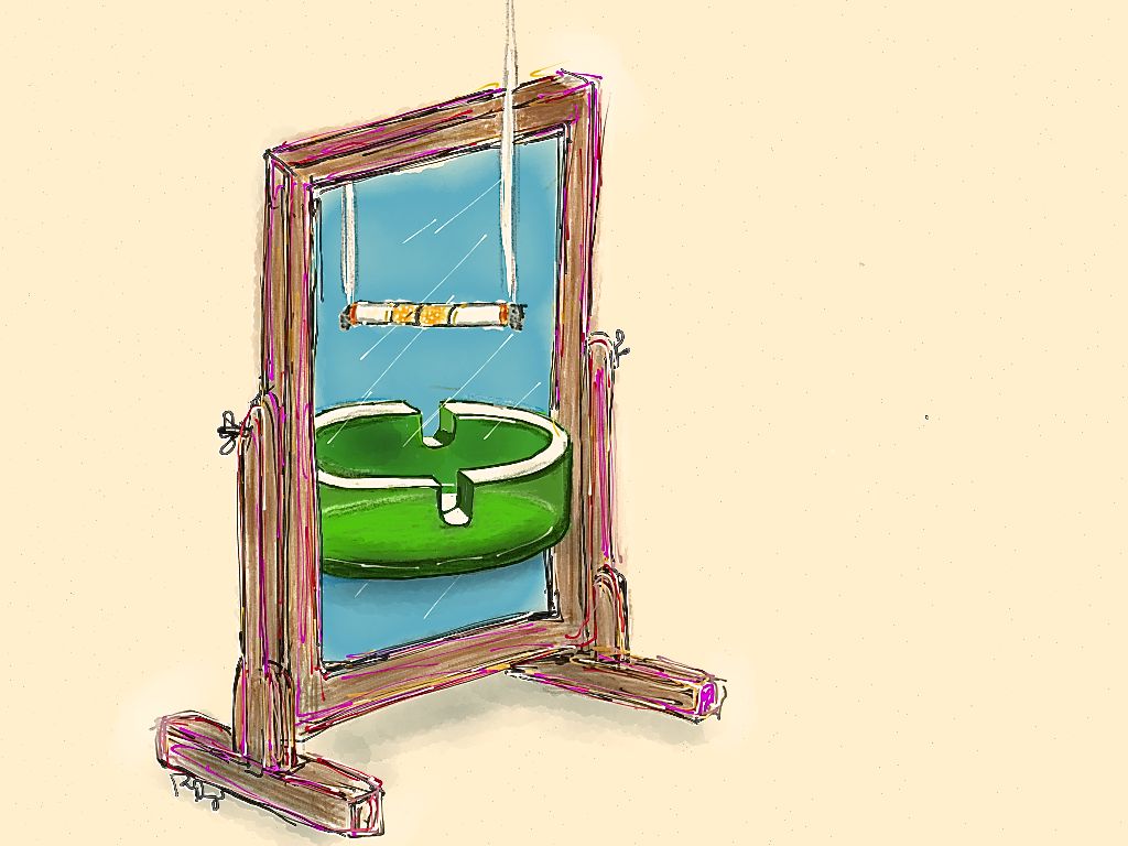 It’s all practice. I’m not sure what it means if it means anything at all, but it was a study in a new technique and an opportunity to play with the familiar image even though I usually have two mirrors facing one another partially. The colored outlines on the mirror frame were my attempt to loosen it up after the fact; I find the drawing tighter than necessary, and I hope to relax over time. I started with the cigarette because it was the first related image that came to mind. I was searching for an image that could stick out the same way it would stick “in,” you know, kinda’ like a two-handed saw. I went with a cigarette instead. I tried to capitalize on the notion of inside vs outside smoke. Then the ashtray happened; and here’s where I tried something new with the lighting and reflection and variegated coloring, something unusual for me and my black & white, stick-figure imagination.