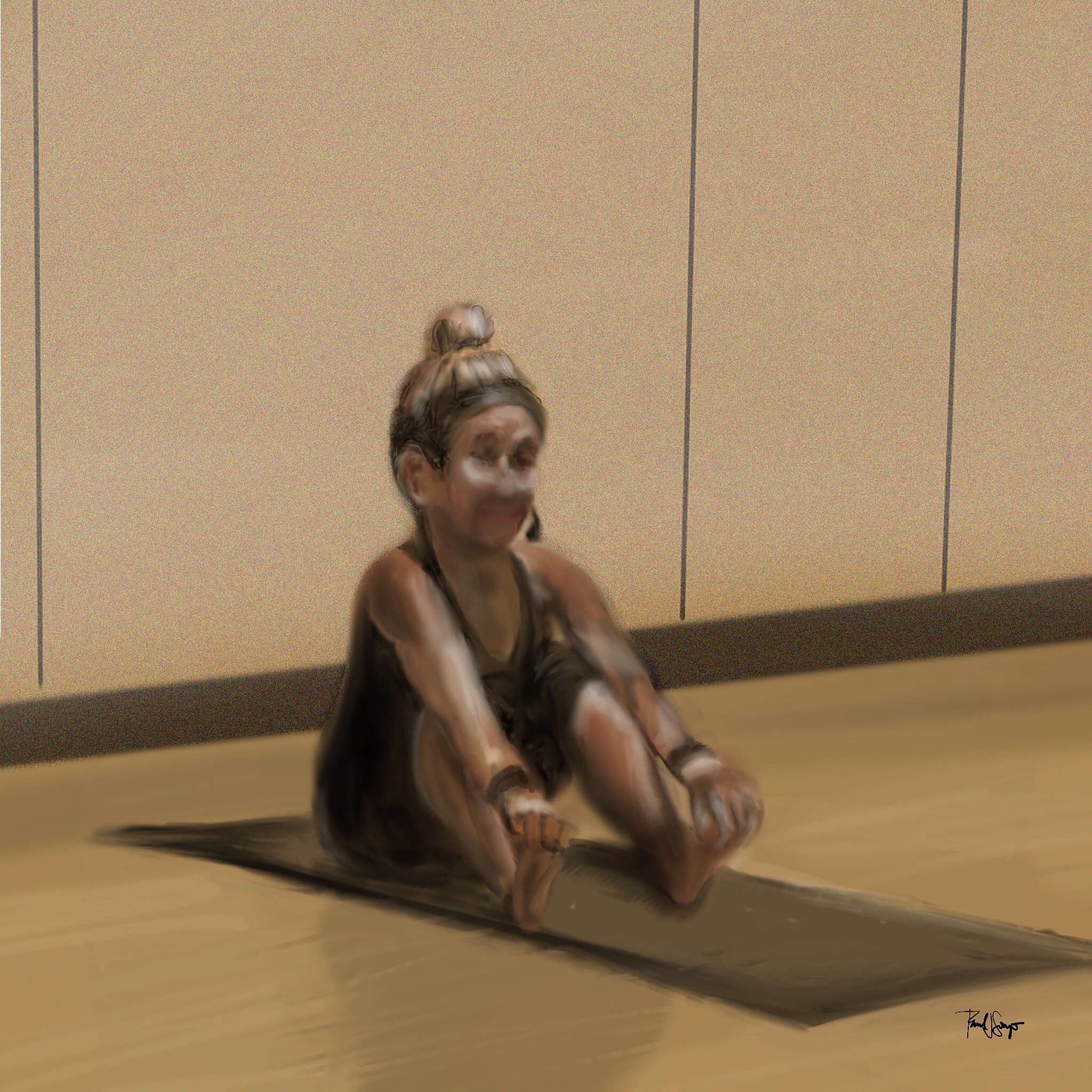 I’ve posted more than 30 digital drawings, paintings, and cartoons about being a beginner yogi, going back to the first months of portfoliolongo. If you’re so inclined, and willing to click on “older posts” several times at the bottom of the webpages, please click here to see all posts tagged “yoga.” Some are more serious than others, but I take my practice very seriously.