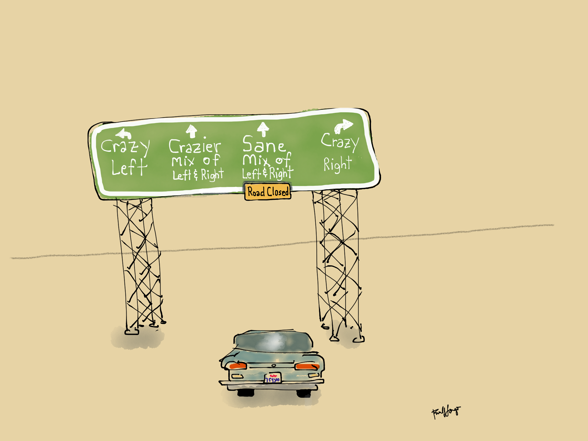 3. Incompetently and inconsistently both right-ish and/or left-ish leaning (i.e., even crazier coming at times from both sides without even knowing it). Derived from Spindler’s Vacillator, the most dangerous and destructive orientation.