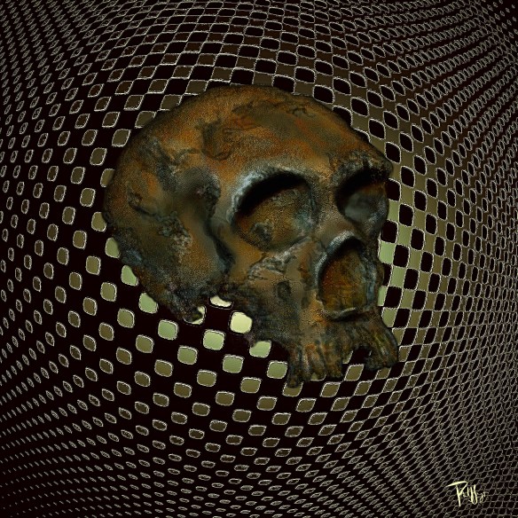 I painted the Neanderthal image on an iPad Pro using Procreate and posted it back in 2016, (see post here including details on the Neanderthal skull). I created the background in Tayasui Sketches and “liquified” it in Procreate in 2019 (see that image further on down). Tolle’s talk prompted me to combine and adjust the two in Procreate and then iColorama as a way of making sense of the corona virus and reactions to it.