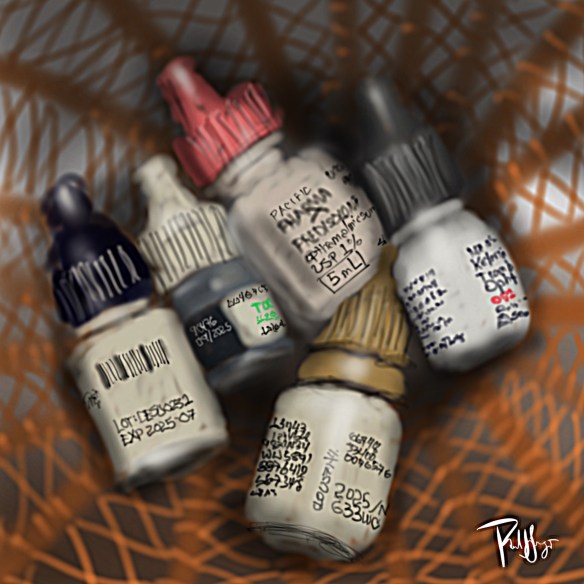 I had to add three temporary eyedrops to the two I normally take because of a recent glaucoma-related procedure. It’s a long story, goes back to 1998. When I saw all of the little eyedrop containers huddled together this afternoon in a little basket, I noticed seeing them while I looked at them.